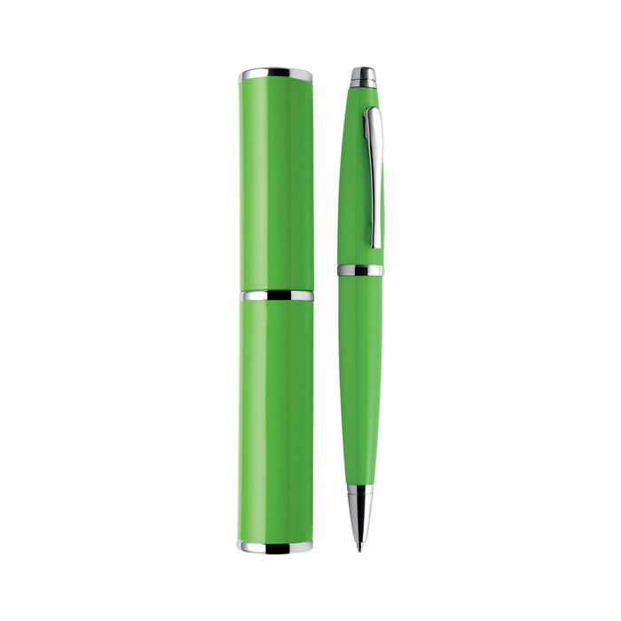 penna a sferameccanismo a rotazionecorpo e cappuccio in lacca lucidaminuterie in metallo cromatorefill in metallo con sfera al tungstenoinchiostro nerocustodia abbinata in tintacorredata di astuccio in cartoncinotecnica di stampa consigliata: serigrafica - tampografica - UV - incisione su penna